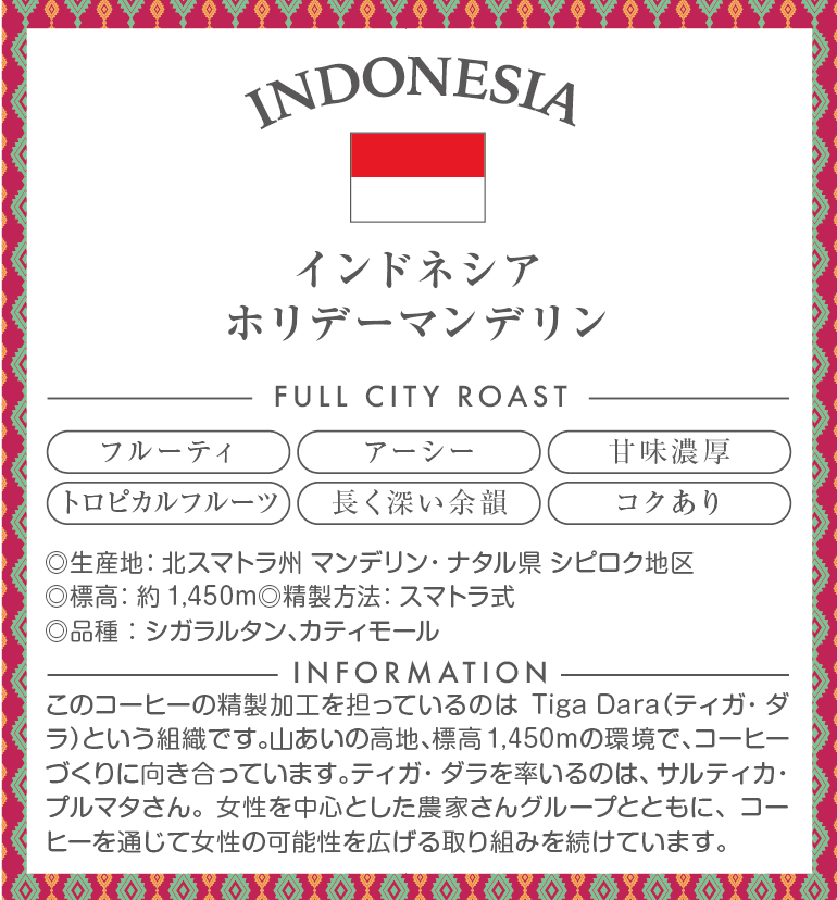 トロピカルフルーツやマンゴーのようなフルーティな風味。マンデリンらしいアーシーさもあり、バランスの良いコーヒーです。